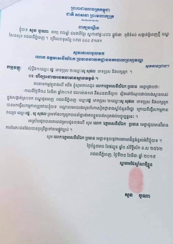 ដោយសារតែកើតទុក្ខមិនសុខចិត្តនឹងទង្វើរបស់ជនបង្កទាំង២នាក់ខាងលើ ទើបលោកសួន បូណា ជាជនរងគ្រោះបានដាក់ពាក្យប្តឹងទៅ អាជ្ញាធរមានសមត្ថកិច្ចហើយ ដើម្បីរកយុត្តិធម៌ជូនលោក៕