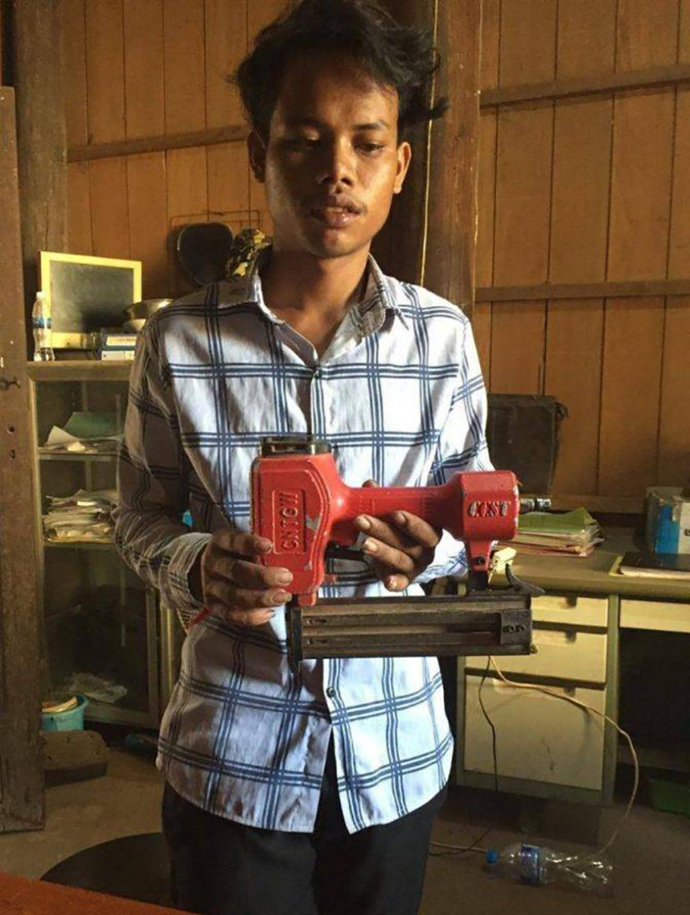 ខេត្តក្រចេះ ៖ ហេតុការណ៍ដ៏ភ្ញាក់ផ្អើលមួយ ដោយសារតែយុវជនម្នាក់បានយកឧបករណ៍សម្រាប់បាញ់ដែកគោល មកជន្លលេងជាមួយនឹងមិត្តភក្តិរួមការងារម្នាក់ លុជ្រុះលដៃ ក៏ចុចចំគន្លឹះ ធ្វើឱ្យគ្រាប់ដែកគោលបាញ់ធ្លាយគូទយុវជនជាមិត្តភក្តិ បណ្តាលឱ្យរងរបួសធ្ងន់ ទីបំផុត ក៏ត្រូវសមត្ថកិច្ចចាប់វាយខ្នោះ នាំយកមកចាត់ការតាមច្បាប់ បានកើតឡើង កាលពីវេលារសៀលថ្ងៃទី៣០ ខែមេសា ឆ្នាំ២០១៩ ស្ថិតក្នុងភូមិសំបូរ ឃុំសំបូរ ស្រុកសំបូរ។