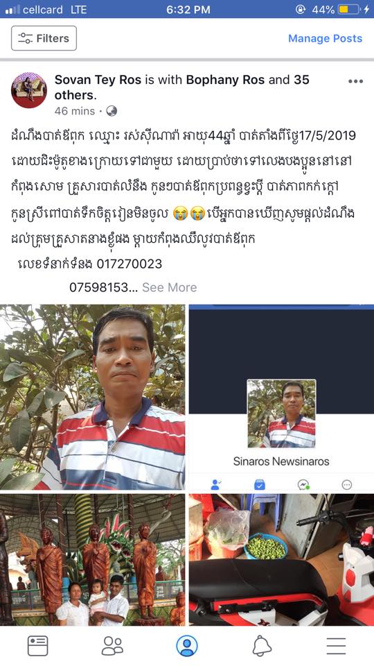 យោងតាមគណនីហ្វេសប៊ុកឈ្មោះ Sovan Tey Ros កាលពីពេលថ្មីៗកន្លងទៅ បានបង្ហោះសារថា “ដំណឹងបាត់ឪពុកឈ្មោះរស់ ស៊ីណារ៉ា អាយុ៤៤ឆ្នាំ បាត់តាំងពីថ្ងៃទី១៧ ខែឧសភា ឆ្នាំ ២០១៩ ដោយជិះម៉ូតូខាងក្រោមទៅជាមួយ ដោយប្រាប់ថា ទៅលេងបងប្អូននៅកំពង់សោម គ្រួសារបាត់ដំណឹង កូនៗបាត់ឪពុក ប្រពន្ធខ្វះប្តី បាត់ភាពកក់ក្តៅ កូនស្រីពៅបាក់ទឹកចិត្តរៀនមិនចូល បើអ្នកបានឃើញ សូមផ្តល់ដំណឹងដល់ក្រុម គ្រួសារនាងខ្ញុំផង ម្តាយខ្ញុំកំពុងឈឺ លេខទំនាក់ទំនង ០១៧ ២៧០ ០២៣…”។