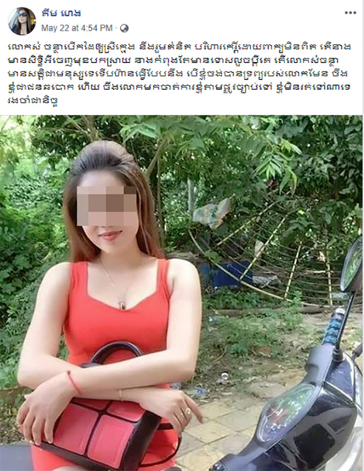 ស្ត្រីជាប្រពន្ធដើម បានសរសេរគណនីក្នុងហ្វេសប៊ុកផ្ទាល់ខ្លួនថា “លោកសំ ចន្ថា ងារជាអភិបាលរងស្រុកបាណន់ មានស្រីខាងក្រៅ នាងខ្ញុំជាប្រពន្ធ តែងតែទុកពេលឱ្យកែខ្លួន តែនៅមិនព្រមកែ។ ថែមទាំងលួចទៅសែនព្រេនជាមួយស្រីក្មេង មិនតែប៉ុណ្ណោះ តែងតែមកធ្វើបាបនាងខ្ញុំ ដោយអំពើហិង្សាគ្រប់រូបភាព មានទាំងធ្ងន់ មានទាំងស្រាល។ នាងខ្ញុំបានទៅដាក់ពាក្យបណ្តឹងដែរ តែបានតែការសម្របសម្រួល ហើយលោកម្នាក់នេះ បានស្រែកថា គ្មានអ្នកអ្នកណាធ្វើអ្វីគេបានទេ។ ពេលខ្លះ នាងខ្ញុំឈឺដើរអត់រួច ហៅពេទ្យមកព្យួរសេរ៉ូម ពេលលោកនេះមកដល់ ទារលុយខ្ញុំអត់បាន ទាញសេរ៉ូមដាច់ ហើយថែមទាំងវាយធ្វើបាបនាងខ្ញុំ ពេលកំពុងឈឺ បិទទ្វារជិត នាងខ្ញុំស្រែកហៅអ្នកជិតខាងឱ្យជួយ តែគ្មានអ្នកណាឮ។ រួចបណ្តេញនាងខ្ញុំចេញពីផ្ទះ គេត្រូវយកបងប្អូនគេ និងស្រីក្មេងគេមកនៅ។ មិនតែប៉ុណ្ណោះ ថែមទាំងបើកដៃឱ្យស្រីក្មេងរបស់គេ ជេរប្រមាថនាងខ្ញុំ នូវពាក្យអសុរោះ។ បន្ទាប់មក យកបងប្រុសដែលជាមន្ត្រីប៉ូលិសម្នាក់ មកជេរដៀលនាងខ្ញុំនូវពាក្យអាសអាភាស នាងខ្ញុំមានពាក្យបណ្តឹងនៅប៉ុស្តិ៍ស្រាប់។ ដីផ្ទះដែលនាងខ្ញុំរស់ នៅរាល់ថ្ងៃនេះ បានធ្វើរួមគ្នា តែលោកម្នាក់នេះ បានរៀបចំក្លែងបន្លំឯកសារលួចចុះឈ្មោះ ម្នាក់ឯងដោយមិនឱ្យនាងខ្ញុំដឹង នាងខ្ញុំមានសាក្សី និងភ័ស្តុតាងមួយចំនួនពាក់ព័ន្ធនឹងដីផ្ទះនេះ។ ពាក្យដែលខ្ញុំនិយាយទាំងប៉ុន្មាន គឺជាពាក្យពិតទាំងអស់ នាងខ្ញុំកាន់ព្រះពុទ្ធសាសនា នាងខ្ញុំមិននិយាយពាក្យមិនពិតទេ ហើយនាងខ្ញុំមិនបានទាមទារឱ្យគេវិលមកវិញទេ ឱ្យគេនៅឱ្យបានសុខចុះ នាងខ្ញុំក៏មិនបានទៅរករឿងរំខានក្តីសុខ គេម្តងណាទេ តែសូមឱ្យគេចូលខ្លួនមកបញ្ចប់បញ្ហា និងផ្តល់សេរីភាពឱ្យគ្នារៀងៗខ្លួន។ បើនៅតែមិនចូលខ្លួនមកបញ្ចប់បញ្ហាទេ នាងខ្ញុំនឹងទៅដល់សាលាស្រុកបាណន់ បើនៅតែគ្មានដំណោះស្រាយទេ នាងខ្ញុំរកវិធីផ្សេងទៀត។ ដូច្នេះសូមបងប្អូនក្នុងសង្គម មេត្តាអធ្យាស្រ័យ ជួយ share ព័ត៌មាននេះឱ្យបានជ្រាបដល់ថ្នាក់ដឹកនាំខាងលើ ឱ្យលោកបានជ្រាបផង។ ខ្ញុំនិយាយនេះ នាងខ្ញុំក៏ខ្មាសគេដែរ តែទ្រាំលែងបានហើយ អស់រយៈពេលពីរឆ្នាំហើយ នៅតែគ្មានដំណោះស្រាយ។ រាល់ពាក្យពេចន៍ ដែលខ្ញុំនិយាយខាង លើជាពាក្យពិត បើមិនពិតដោយប្រការណាមួយ នាងខ្ញុំហ៊ានទទួលខុសត្រូវ ចំពោះមុខច្បាប់…”។