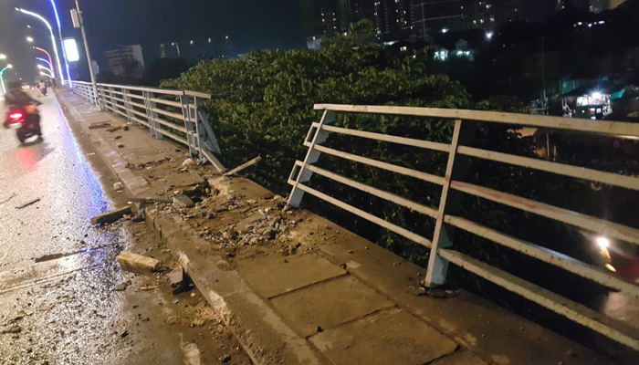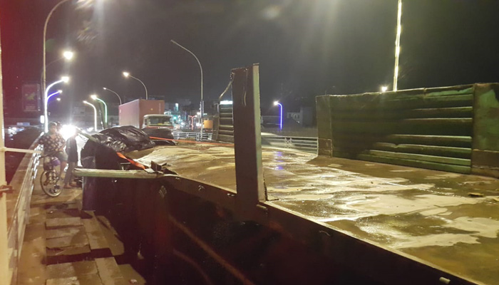 ភ្នំពេញ ៖ រថយន្តសណ្តោងកុងតឺន័រ១គ្រឿង មានដឹកដុំដែកទំងន់រាប់តោន បានបើកឡើងស្ពានព្រះមុនីវង្ស ស្រាប់តែដាច់ខ្សែកាបចំណង ធ្វើឱ្យដុំដែករមៀលទៅខាងឆ្វេងដៃ បណ្តាលឱ្យបាក់ជញ្ជាំងដែករថយន្ត ហើយរមៀលធ្លាក់ទៅបុកបង្កាន់ដៃស្ពានបាក់ធ្លាក់ចុះមកក្រោមស្ពានដល់ដី រងការខូចខាតយ៉ាងដំណំ។