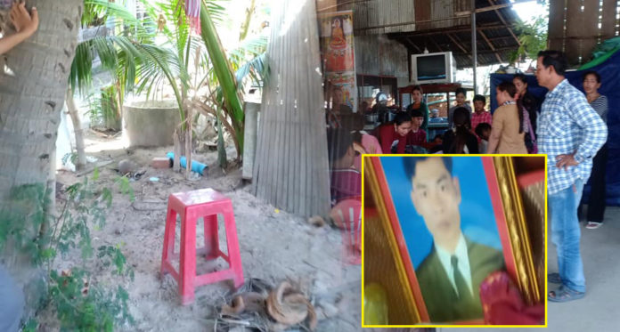 ភ្នំពេញ ៖ បុរសជាមេភូមិម្នាក់ មិនដឹងជាជួបវិបត្តិផ្លូវចិត្តរឿងអ្វី ក៏ដាច់ចិត្តចងកសម្លាប់ខ្លួន បណ្តាលឱ្យស្លាប់យ៉ាងអាណោចអាធ័ម បង្កឱ្យមានការភ្ញាក់ផ្អើលឡើង កាលពីវេលាម៉ោង៥និង២០នាទីទៀបភ្លឺ ថ្ងៃទី១២ ខែមិថុនា ឆ្នាំ២០១៩ នៅចំណុចរោងអង្គុយលេងក្រោយផ្ទះរបស់ជនរងគ្រោះ ស្ថិតនៅផ្ទះគ្មានលេខ ផ្លូវ១៥១ ស្ថិតក្នុងភូមិព្រៃពង្រ សង្កាត់ពញាពន់ ខណ្ឌព្រែកព្នៅ។