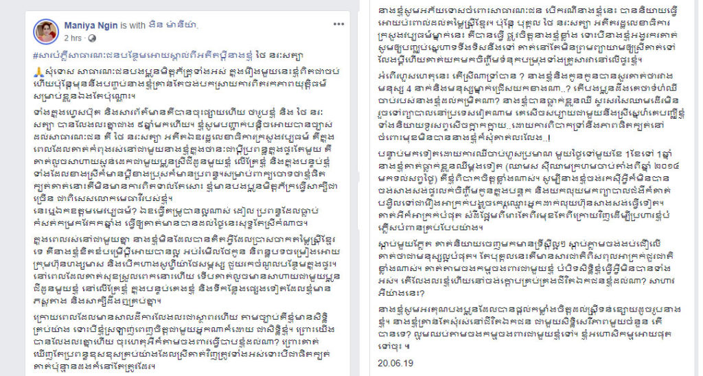 លោកស្រីងួន ម៉ានីយ៉ា បានបង្ហោះសារបំភ្លឺរឿងប្តីបោទប្រកាន់ថា “សារបំភ្លឺសាធារណៈជនបន្ថែមអោយស្គាល់ពីអតីតប្តីនាងខ្ញុំ ថៃ នរៈសត្យា សុំទោសសាធារណៈជនបងប្អូនមិត្តភ័ក្រ្តទាំងអស់ ក្នុងរឿងមួយនេះ ខ្ញុំពិតជាចប់ហើយ ប៉ុន្តែមុននឹងបញ្ចប់ នាងខ្ញុំគ្រាន់តែចង់បកស្រាយការពិតរកភាពយុត្តិធម៌សម្រាប់ខ្លួនឯងតែប៉ុណ្ណោះ”។