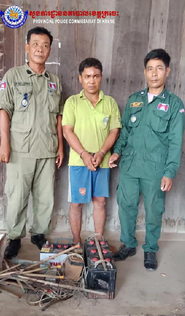 ក្រចេះ៖ បុរសម្នាក់កំពុងតែរាយអន្ទាក់ឆក់សត្វព្រៃដែលកំពុងតែអភិរក្ស នៅក្នុងព្រៃការពារមួយកន្លែង ត្រូវបានសមត្ថកិច្ចចុះឃាត់ខ្លួនបានភ្លាមៗ នាំខ្លួនមកសាកសួរនៅប៉ុស្តិ៍ប៉ូលិស។