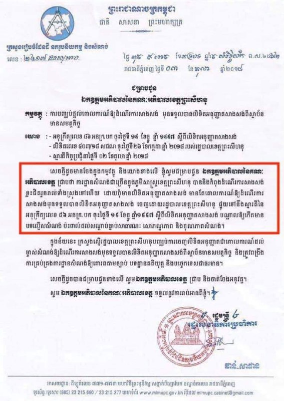 កម្មវត្ថុ៖ កាបញ្ឈប់ផ្តល់គោលការណ៍ដោយដំណើរការសងសង់ មុនទទួលបានលិខិតអនុញ្ញាសាងសង់ពីស្ថាប័នមានសមត្ថកិច្ច