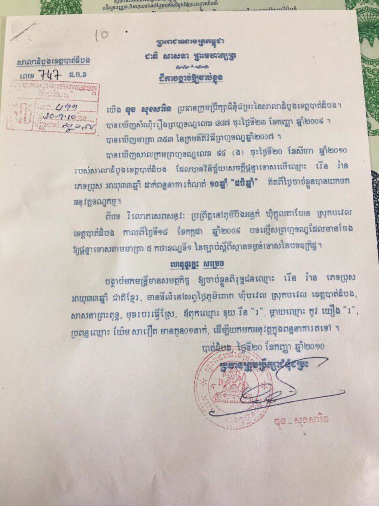 សមត្ថកិច្ចបានបញ្ជាក់ថា ប្រតិបត្តិការចាប់ខ្លួនជនសង្ស័យខាងលើ ធ្វើឡើងដោយកម្លាំងជំនាញសហការជាមួយកម្លាំងអន្តរាគមន៍ដោយអនុវត្តដីកាបង្គាប់ចាប់ខ្លួន លេខ ៧៤៧ ដ.ច.ខ ចុះថ្ងៃទី២០ ខែកញ្ញា ឆ្នាំ២០១០ របស់លោកឌុច សុខសារិន ប្រធានក្រុមប្រឹក្សាជំនុំជម្រះនៃសាលាដំបូងខេត្តបាត់ដំបង។
