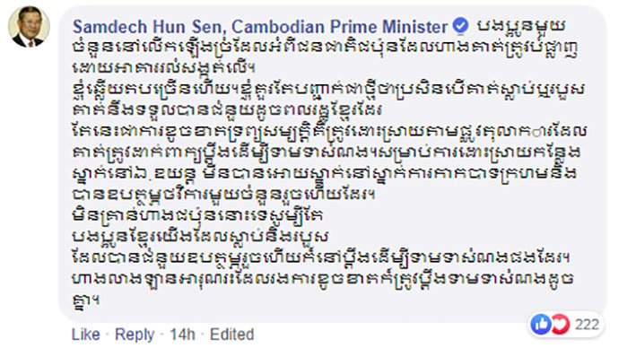 សម្តេចហ៊ុន សែន បាន Comment ក្នុងផេកផ្លូវការរបស់សម្តេចថា “បងប្អូនមួយចំនួននៅលើកឡើងច្រំដែល អំពីជនជាតិជប៉ុន ដែលហាងគាត់ត្រូវបំផ្លាញដោយអាគាររលំសង្កត់លើ”។