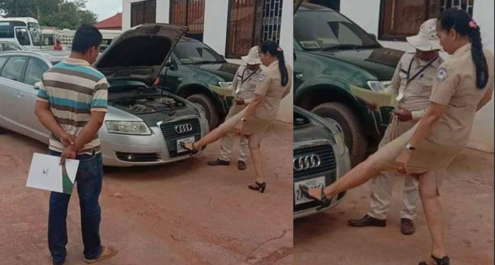 នៅក្នុងរូបថតប៉ុន្មានសន្លឹកដែលបានបែកធ្លាយលើបណ្តាញសង្គមហ្វេសប៊ុកនោះ គេបានឃើញសកម្មភាពមន្ត្រីរូបនោះជាមួយនិងមន្ត្រីម្នាក់ទៀតជាបុរស បានឈរពីមុខកំពុងត្រួតពិនិត្យ ស្រាប់តែពេលនោះមន្ត្រីរូបនោះបានយកជើងឆ្វេងចង្អុលស្លាកលេខរថយន្ត ដែលមើលទៅមិនទំនងទាល់តែសោះ។