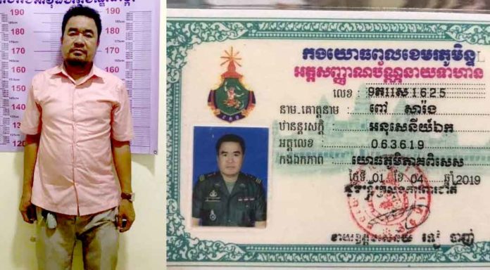 បុរសជាមន្ត្រីយោធាបាញ់បោះសេរី ដែលត្រូវសមត្ថកិច្ចឃាត់ខ្លួន មានឈ្មោះពៅ សារ៉ង ភេទប្រុស អាយុ៤៣ឆ្នាំ ជាមន្ត្រីយោធាឋានន្តរស័ក្តិអនុសេនីយឯក អត្តលេខ០៦៣៦១៩ កងឯកភាពយោធភូមិភាគពិសេស ស្នាក់នៅផ្ទះលេខ០៦ បុរីពិភពថ្មីផ្លូវលេខ១១០ ភូមិថ្មី សង្កាត់ដង្កោ ខណ្ឌដង្កោ។