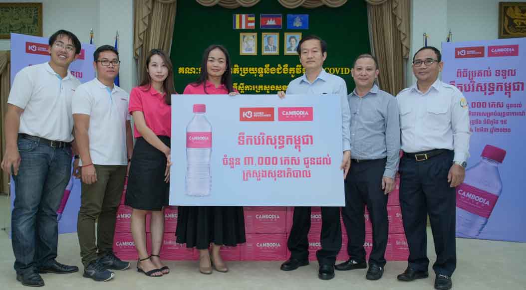 ក្រុមហ៊ុន ខ្មែរ ប៊ែវើរីជីស បរិច្ចាគទឹកបរិសុទ្ធកម្ពុជា ចំនួន៣០០០កេស ជូនក្រសួងសុខាភិបាល ដើម្បីប្រើប្រាស់ក្នុងយុទ្ធនាការប្រយុទ្ធប្រឆាំងនឹងការចម្លងជំងឺកូវីដ-១៩។ ពិធីប្រគល់ទឹកបរិសុទ្ធកម្ពុជា ធ្វើឡើងនៅក្រសួងសុខាភិបាល នាថ្ងៃទី២៤ ខែមីនា ឆ្នាំ២០២០។