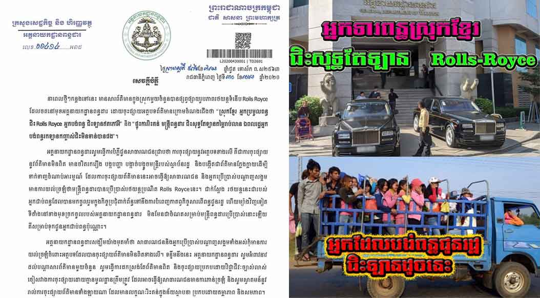Homeព័ត៌មានជាតិស្ថាប័នពន្ធដារ បំភ្លឺ “ស្រុកខ្មែរ អ្នក ប្រមូលពន្ធ ជិះ Rolls Royce អ្នកបង់ពន្ធជិះឡានឥតកៅអី”
