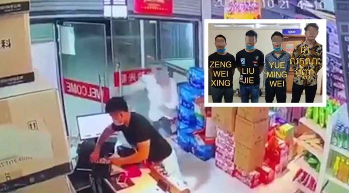 ខេត្តព្រះសីហនុ ៖ ជនសង្ស័យមួយក្រុមមានគ្នា៦នាក់ ដែលបានបន្លំខ្លួនធ្វើជាភ្ញៀវចូលទិញទំនិញនៅក្នុងហាងមួយកន្លែង រួចឆ្លៀតឱកាសបាញ់ស្ព្រាយ៍ចូលភ្នែកអ្នកគិតលុយ ធ្វើឱ្យជនរងគ្រោះមើលអ្វីមិនឃើញតតាំងមិនបាន ក៏ព្រួតគ្នាវាយធ្វើទារុណកម្ម និងប្លន់យកលុយ ព្រមទាំងទ្រព្យសម្បត្តិមានតម្លៃមួយចំនួននៅក្នុងហាងលក់ដូរមួយកន្លែង កណ្តាលក្រុងព្រះសីហនុ កាលពីយប់ថ្ងៃទី១០ ខែមីនា ឆ្នាំ២០២០ កន្លងទៅ ត្រូវបានសមត្ថកិច្ចជំនាញស្រាវជ្រាវតាមប្រមាញ់ចាប់ខ្លួនបានចំនួន៤នាក់ ក្នុងនោះមានជនជាតិខ្មែរម្នាក់។