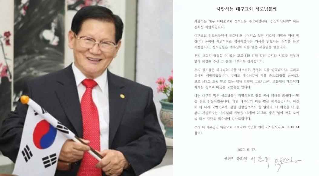 លោកប្រធានលី ម៉ាន់ហ៊ី ប្រធាននៃទីបរិសុទ្ធរបស់ព្រះវិហារ រោងឧបោសថនៃសេចក្តី បន្ទាល់សាសនាគ្រឹស្ទស៊ីនឆន់ជី បានថ្លែងអំណរគុណដល់សមាជិកក្រុមជំនុំព្រះវិហារស៊ីនឆន់ជី នៅទីក្រុងដេកូ (Dae-gu) ដែលបានផ្តល់នូវប្លាស្មា ដែលត្រូវការសម្រាប់ការអភិវឌ្ឍការព្យាបាលជំងឺ កូវីដ-១៩ ។