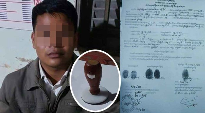 ខេត្តកណ្តាល ៖ បុរសជាបុគ្គលិកធនាគារម្នាក់បានប្រើល្បិចបន្លំត្រាមេឃុំ ទៅបោកប្រាស់ប្រជាពលរដ្ឋដើម្បីដាក់ទ្រព្យនិងលិខិតផ្សេងៗ ក្នុងការយកលុយពីធនាគារចំនួន៣ម៉ឺនដុល្លារ ទីបំផុតបែកធ្លាយរឿងរ៉ាវ ក៏ត្រូវលោកមេឃុំជាជនរងគ្រោះដាក់ពាក្យបណ្តឹងឱ្យសមត្ថកិច្ចចាប់ខ្លួននាំយកទៅចាត់ការតាមច្បាប់។