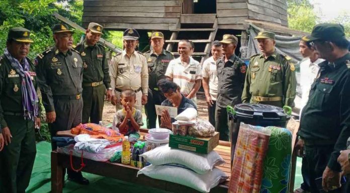 ដើម្បីសម្រាលដល់ការខ្វះខាត និងលំបាកវេទនារបស់បុរសពិការភ្នែកទាំងសងខាង និងកូនប្រុសតូចនេះ លោកមេបញ្ជាការបាននាំអំណោយយកទៅប្រគល់ជូន រួមមាន ថវិកា ១៥ម៉ឺនរៀល អង្ករ ២ការ៉ុង មី ១កេស ត្រីខ ២យួរ ទឹកស៊ីអ៊ីវ ១យួរ ខ្លាញ់ ១ដប ស្ក-សរ ១គីឡូ ខ្ទឹមស ២គីឡូ ប៊ីចេង កន្លះគីឡូ ស្បែកជើងផ្ទាត់ ១សម្រាប់ ក្រមា១ ខោអាវ ២កំប្លេ ភូយ១ ខ្នើយ២ គ្រែដេក១ សាប៊ូម្សៅ ១គីឡូ ឆ្នាំងបាយ២ ចានបាយ ៥ ចានសម្ល ៥ ស្លាបព្រា ៥ និងធុងទឹក ១ ។