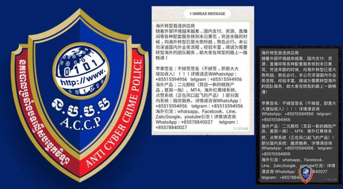 នៅលើទំព័រគណនី នាយកដ្ឋានប្រឆាំងបទល្មើសបច្ចេកវិទ្យា បានបង្ហោះសារថា “ចាប់តាំងពីព្រឹកមិញនេះ នាយកដ្ឋានប្រឆាំងបទល្មើសបច្ចេកវិទ្យា បានសង្កេតឃើញថា មានបងប្អូនប្រជាពលរដ្ឋយើងជាច្រើននាក់ បានទទួលសារតាមរយៈបណ្ដាញទំនាក់ទំនងសង្គម WhatsApp ជាភាសាចិន ដូចមានក្នុងរូបភាពខាងក្រោមនេះ”។