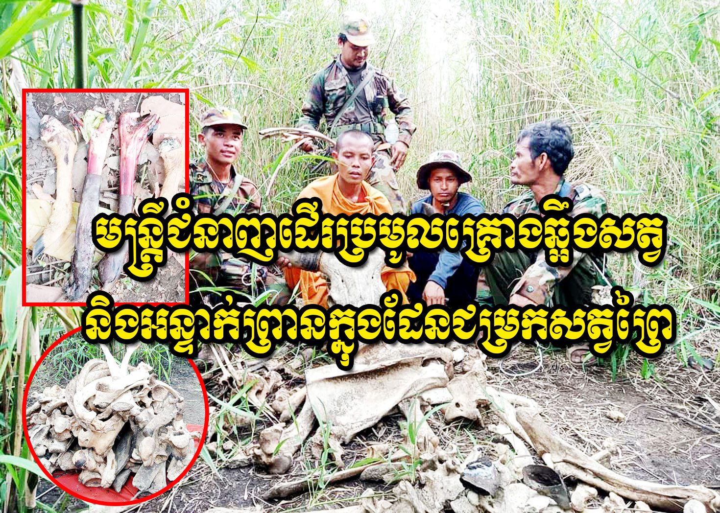 ខេត្តឧត្តរមានជ័យ ៖ គ្រោងឆ្អឹងសត្វងាប់ចាស់ថ្មី ក្រោមស្នាដៃអន្ទាក់ព្រាន ត្រូវបានព្រះសង្ឃ និងកម្លាំងគណៈកម្មការ និងមន្ត្រីយោធាការពារតំបន់ដែនជម្រកសត្វព្រៃ សង្ឃរុក្ខវ័ន នៅខេត្តឧត្តរមានជ័យ ដើរចុះល្បាត បានប្រទះឃើញស្ថិតតំបន់ខាងលិចភ្នំភ្ជៀវ និងខាងជើងភ្នំស្វាយ ចុងប្រភពទឹកក្នុងព្រៃសន្លុង ភូមិគោលសំព័រ ឃុំលំទង ស្រុកអន្លង់វែង។