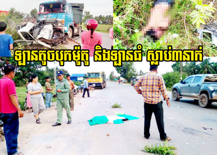 ខេត្តកែប ៖ រថយន្តនីស្សាន់ ១គ្រឿង បើកបរក្នុងល្បឿនយ៉ាងលឿនដូចហោះ លុះមកដល់ត្រង់ចំណុចផ្លូវកោងមិនបន្ថយល្បឿន ក៏ជ្រុលទៅបុកម៉ូតូ ១គ្រឿង បណ្តាលឱ្យបុរសជាអ្នកជិះម៉ូតូ ២នាក់ ស្លាប់នៅនឹងកន្លែងយ៉ាងអាណោចអាធ័ម ចំណែករថយន្តនីស្សាន់ មិនទាន់អស់ល្បឿន ក៏ជ្រុលទៅបុករថយន្តធុនធំ ប្រភេទសណ្តោង ១គ្រឿងទៀត បណ្តាលឱ្យកៀបជាប់តៃកុងស្លាប់ក្នុងកាប៊ីនរថយន្តគួរឱ្យរន្ធត់។