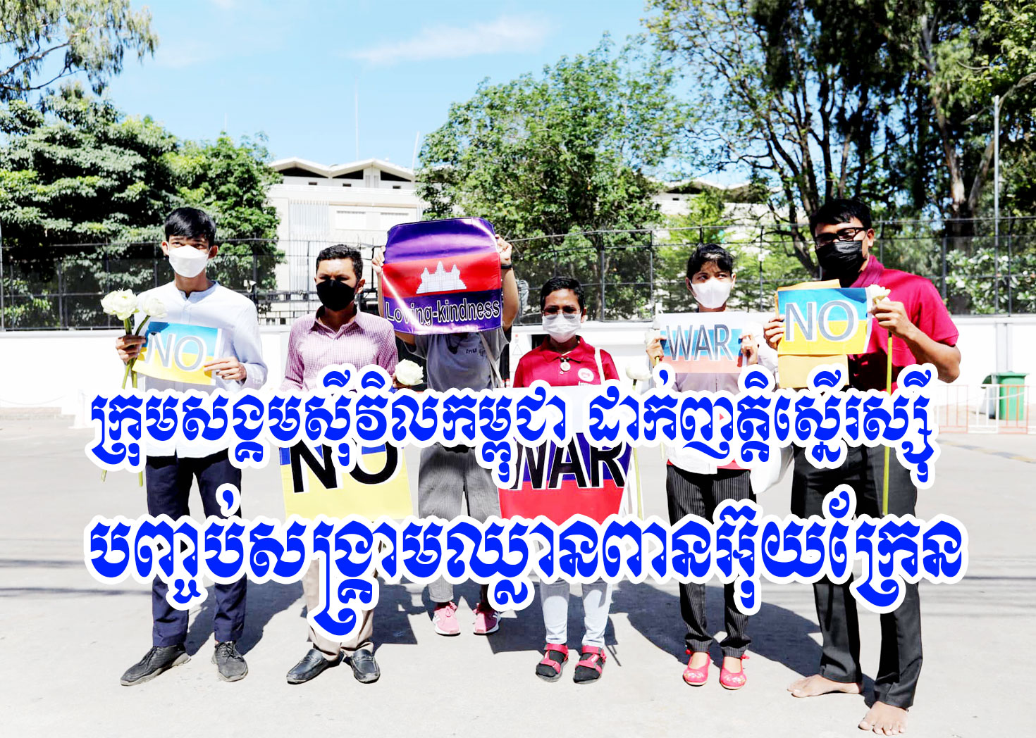 ជាទិដ្ឋភាពក្នុងការយកញត្តិទៅដាក់នៅស្ថានទូតរុស្ស៊ី នាព្រឹកនោះ យុវជន ៦នាក់ ដែលជាតំណាងនៃក្រុមអង្គការសង្គមស៊ីវិលទាំងនោះ បានកាន់បដាមានរូបទង់ជាតិកម្ពុជា ទង់ជាតិអ៊ុយក្រែន និងទង់ជាតិរុស្ស៊ី ដោយបដាដែលមានរូបទង់ជាតិប្រទេសទាំងបី មានសរសេរអក្សរអង់គ្លេស។ បដា ដែលមានរូបទង់ជាតិកម្ពុជា សរសេរថា “Loving-Kindness” (ក្តីស្រឡាញ់-ក្តីមេត្តា) ។ ចំណែកបដាដែលមានរូបទង់ជាតិអ៊ុយក្រែន សរសេរថា “No” (គ្មាន) និងបដាដែលមានរូបទង់ជាតិរុស្ស៊ី សរសេរថា “War” (សង្គ្រាម) ដោយបូកពាក្យក្នុងបដាដែលមានរូបទង់ជាតិប្រទេសទាំងពីរនេះបញ្ជូលគ្នា មានន័យជារួមថា “គ្មានសង្គ្រាម”។ បន្ថែមលើនេះ ពួកគេក៏មានកាន់ផ្កាឈូកនៅក្នុងដៃផងដែរ។