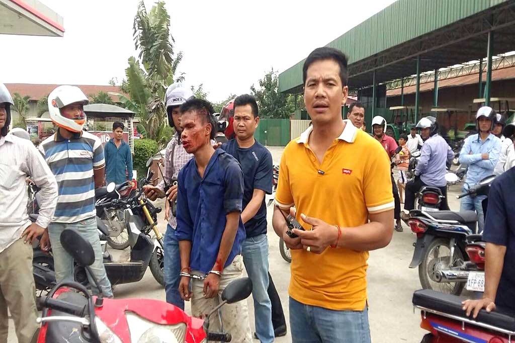 តាមប្រភពព័ត៌មានពីប្រជាពលរដ្ឋបានអោយដឹងថាមុនពេលកើតហេតុគេឃើញមានជន សង្ស័យក្មេងៗ២នាក់បានទៅរកទិញស្បែកជើងខណៈពេលកំពុងតែរើសស្បែកជើងស្រាប់ តែជនម្នាក់បានលួចស្បែកជើងដាក់ចូលក្នុងអាវពេលនោះអ្នកលក់សួរនាំជនសង្ស័យក៏ បាន​ទុកស្បែកជើងហើយជិះកង់ចេញទៅត្រូវអ្នកអ្នកលក់ស្រែកថាចោរៗ និងប្រាប់ឲ្យប្អូន អ្នកលក់​ជិះម៉ូតូ​ដេញតាម​ដល់ច្រមុះជ្រូកស្ទឹងមានជ័យ ស្រាប់តជនសង្ស័យម្នាក់ដែលអង្គុយ​នៅ ខាងក្រោយបនទាញកាំបិតបុ័ងតោកាប់ធ្វើឲ្យអ្នកដេញតាមភ័យលែងហ៊ានដេញ តាម​ទៀត ស្របពេលនោះមានមន្រី្តកងរាជអាវុហត្ថក្រុងភ្នំពេញ២នាក់បានឮប្រជាពលរដ្ឋ​ស្រែក​ថាចោរៗក៏បានដេញតាមរហូតដល់ផ្លូវបត់ចូលកន្លែងចាក់សំរាមស្ទឹងមានជ័យដើម្បី សួរនាំ​ក៏ត្រូវបានជនសង្ស័យដែលជិះកង់រត់នោះបានដកកាំបិតបុ័ងតោកាប់ទៅលើមន្ត្រីអាវុធ​ហត្ថ​​នោះដោយខ្លួនគេចមិនផុតក៏ចំដៃខាងធ្វេងរងរបួសធ្ងន់។ភ្លាមៗនោះជនសង្ស័យ ជាអ្នក​កាប់​បានរត់គេចខ្លួន នៅសល់តែជនសង្ស័យជាអ្នកជិះកង់ត្រូវបានអាវុធហត្ថចាប់​បានត្រូវ​ប្រជា​ពល​រដ្ឋចាប់វាយទ្រពខ្លួន ។