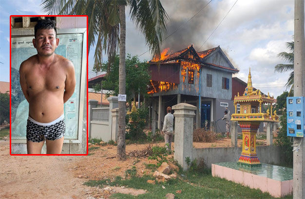 តាកែវ ៖ ជនសង្ស័យម្នាក់ តែងប្រើប្រាស់ថ្នាំញៀនជាប្រចាំ រហូតដល់លែងដឹងខុសត្រូវ ចេះតែរករឿង ឈ្លោះ ប្រកែកជាមួយម្តាយចិញ្ចឹមរបស់ខ្លួន ជាញឹកញាប់ រហូតចុងក្រោយ បែកគំនិតធ្វើសកម្មភាពដុតផ្ទះម្តាយចិញ្ចឹម បណ្តាលឱ្យឆេះអស់ទាំងស្រុង បង្កឱ្យមានការភ្ញាក់ផ្អើលដល់សមត្ថកិច្ចចុះអន្តរាគមន៍ និងចាប់វាយខ្នោះកូន ចិញ្ចឹមចិត្តនោះ យកទៅចាត់ការតាមច្បាប់។