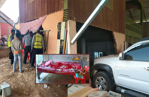 ខេត្តតាកែវ ៖ បុរសម្នាក់ បានបើករថយន្តតូយ៉ូតា តាកូម៉ា ១គ្រឿង ចូលផ្ទះរបស់ខ្លួន ស្រាប់តែជ្រុលទៅបុកជញ្ជាំងផ្ទះ ធ្វើឱ្យបាក់ជញ្ជាំងថ្ម សង្កត់ស្ត្រីចំណាស់ជាម្តាយក្មេក បណ្តាលឱ្យស្លាប់នៅនឹងកន្លែងយ៉ាងអាណោចអាធ័ម។