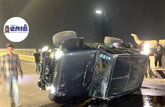 ភ្នំពេញ ៖ បុរសម្នាក់ បើករថយន្តទំនើប ម៉ាក Jeep មួយគ្រឿង ឡើងស្ពានកោះនរា ក្នុងល្បឿនយ៉ាងលឿន មិនប្រយ័ត្ន បានរេចង្កូតទៅបុករបាំងថ្មពុះចែកទ្រូងស្ពាន បណ្តាលឱ្យក្រឡាប់ផ្ងារជើងរងការខូចខាតយ៉ាងដំណំ។ករណីនេះ បានកើតឡើង កាលពីវេលាម៉ោង ១០និង៣០នាទីយប់ ថ្ងៃទី០៥ ខែកុម្ភៈ ឆ្នាំ២០២៤ នៅចំណុចគល់ ស្ពានកោះនរា ស្ថិតក្នុងសង្កាត់ទន្លេបាសាក់ ខណ្ឌចម្ការមន។
