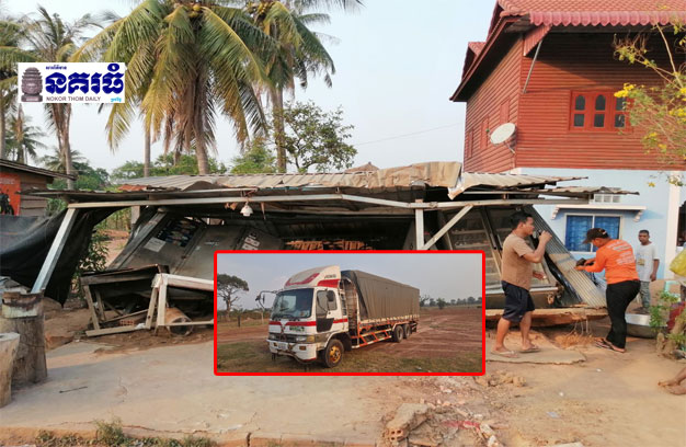 ខេត្តឧត្តរមានជ័យ ៖ តូបលក់គ្រឿងក្លែម ពោះគោទឹកប្រហុក ពងទាកូន មួយកន្លែង ត្រូវបានឡានធុនធំ ប្រភេទខ្នាតយក្ស ១គ្រឿង បើកថយក្រោយ ឆ្លងកាត់ថ្នល់ ជ្រុលមកបុកទាំងកំរោល បណ្តាលឱ្យរលំបះជើងច្រងាង រងការខូតខាតស្ទើរទាំងស្រុង តែសំណាងល្អ ពុំបង្កមនុស្សណាម្នាក់រងរបួសឡើយ។