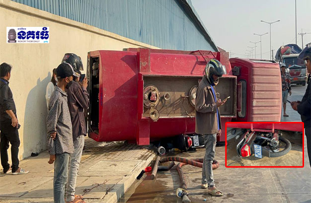 ភ្នំពេញ ៖ រថយន្តដឹកទឹក ១គ្រឿង មានទឹកពេញស៊ីទែន បើកបរក្នុងល្បឿនលឿន លុះក្រោយមក មិនដឹងជាយ៉ាងម៉េច ស្រាប់តែរេចង្កូតឡើងលើខឿនចិញ្ចើមផ្លូវ រួចក្រឡាប់សង្កត់លើម៉ូតូ ១គ្រឿងខ្ទេច ប៉ុន្តែបុរសម្នាក់និងស្ត្រីម្នាក់ដែលជាអ្នកជិះម៉ូតូ សំណាងល្អ ខ្ទាតចេញផុត ទើបគ្រាន់តែរបួសស្រាលប៉ុណ្ណោះ។