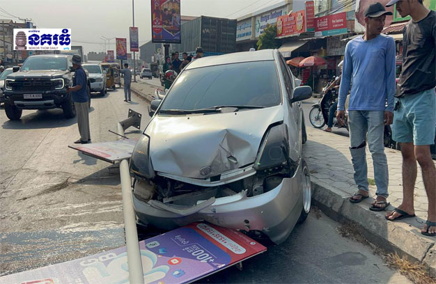 ភ្នំពេញ ៖ រថយន្ត ១គ្រឿង បើកបរក្នុងល្បឿនលឿន រួចក៏រេចង្កូតឡើងលើខឿនសួនពុះចែកទ្រូងផ្លូវ បុកបង្គោលភ្លើង ១ដើម បណ្តាលឱ្យ បាក់ដាច់២កំណាត់ និងរលើងគល់តែម្តង។ ចំណែករថយន្តបង្កហេតុ បានវិល១ជុំ ស្ទើររងការខូចខាតខ្ទេចមុខ តែសំណាងល្អ អ្នកបើកបរមិនមានរងរបួសអ្វីនោះទេ ហើយក្រោយកើតហេតុ ត្រូវបានសមត្ថកិច្ចឃាត់ខ្លួនភ្លាមៗ។