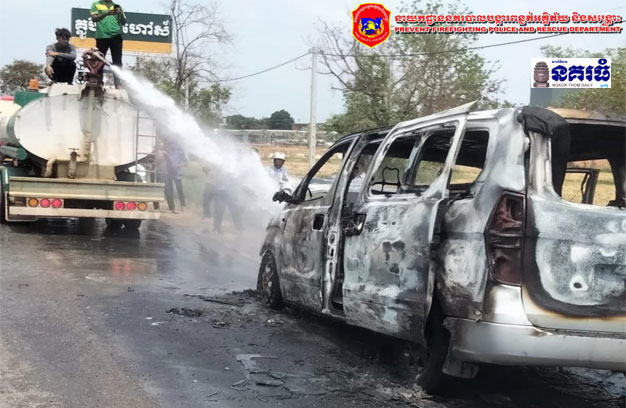 ខេត្តបាត់ដំបង ៖ រថយន្ត ១គ្រឿង កំពុងបើកបរលើដងផ្លូវសុខៗ ស្រាប់តែកើតមានភ្លើងឆាបឆេះយ៉ាងសន្ធោសន្ធៅ បណ្តាលឱ្យរថយន្តត្រូវភ្លើងឆេះបំផ្លាញអស់ សល់តែគ្រោងឆ្អឹងដែកចំណែកអ្នកបើកបរ បានរត់គេចបាត់។
