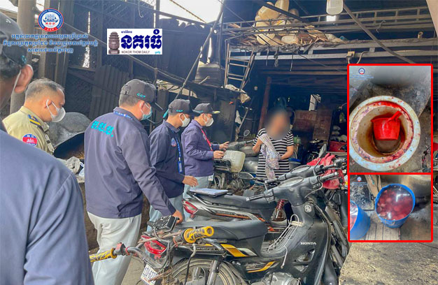 ភ្នំពេញ ៖ មន្ត្រីជំនាញអគ្គនាយកដ្ឋានការពារអ្នកប្រើប្រាស់ កិច្ចការប្រកួតប្រជែង និងបង្ក្រាបការក្លែងបន្លំ (ក.ប.ប) សហការជាមួយអាជ្ញាធរ និងសមត្ថកិច្ចមូលដ្ឋាន បានចុះត្រួតពិនិត្យណែនាំ និងអប់រំ នៅទីតាំងផលិតឈាមជ្រូក និងសណ្តែកបណ្តុះ ចំនួន២ទីតាំង ស្ថិតនៅភូមិ១៧ សង្កាត់បឹងសាឡាង ខណ្ឌទួលគោក ដោយក្នុងនោះមន្ត្រីជំនាញបានរកឃើញ ផលិតផលឈាមជ្រូក ធ្វើអំពីឈាមគោ ប្រមាណជាង៥០គីឡូក្រាម ព្រមទាំងសណ្តែកបណ្តុះ មានដាក់បន្ថែមសារធាតុគីមី ប្រមាណជាង២០គីឡូក្រាម។