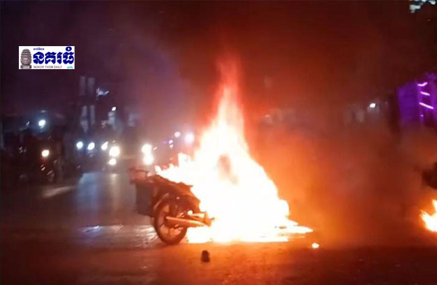 កង់បីបុកម៉ូតូ ផ្ទុះឆេះហ្មត់ទាំង២