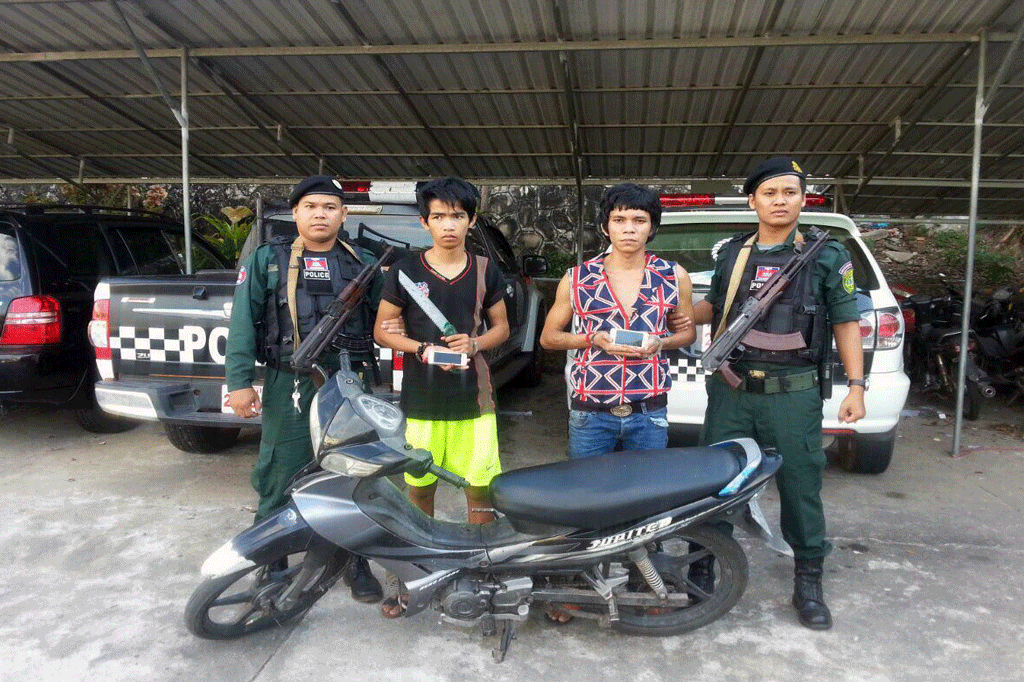 ខេត្តព្រះសីហនុ ៖ ជនសង្ស័យចំនួន២នាក់ ដែលជាមុខសញ្ញាតែងធ្វើសកម្មភាពភ្ជង់កាំបិត គំរាមប្លន់ភ្ញៀវទេសចរនៅពេលយប់ យ៉ាង សកម្មក្នុងក្រុងព្រះសីហនុ ត្រូវបានសមត្ថកិច្ច ស្រាវជ្រាវចាប់ឃាត់ខ្លួនបាន កាលពីថ្ងៃទី២៧ ខែកុម្ភៈ ឆ្នាំ២០១៧ បន្ទាប់ពីជនសង្ស័យទាំង ២នាក់ បានភ្ជង់ប្លន់ទូរស័ព្ទ ព្រមទាំងទ្រព្យសម្បត្តិ ពីនារីរងគ្រោះចំនួន២នាក់ កាលពីយប់ថ្ងៃទី២៥ ខែកុម្ភៈ ឆ្នាំ២០១៧ នៅចំណុចភូមិ៥ សង្កាត់ លេខ៤ ក្រុងព្រះសីហនុ។