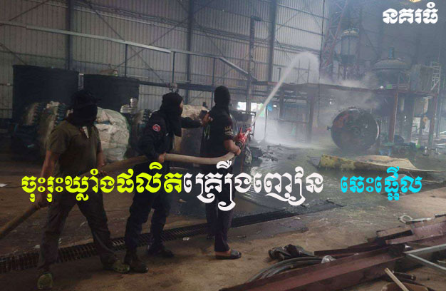 ខេត្តស្វាយរៀង ៖ ស្ថាប័នតុលាការ បានឱ្យក្រុមជាង ចុះរុះរើឃ្លាំងនិងសម្ភារៈផលិតគ្រឿងញៀន មួយកន្លែង ដែលសមត្ថកិច្ចបានបង្ក្រាបនិងចាប់ខ្លួនក្រុមឧក្រិដ្ឋជន យកទៅផ្តន្ទាទោស នាពេលកន្លងមក ស្រាប់តែខ្ទាតផ្កាភ្លើង បង្កឱ្យមានការឆាបឆេះឃ្លាំងខាងលើ យ៉ាងសន្ធោសន្ធៅ ត្រូវបានកម្លាំងសមត្ថកិច្ចជំនាញ បញ្ជូនរថយន្តពន្លត់អគ្គិភ័យ ចុះអន្តរាគមន៍បាញ់ទឹកអស់ ៦រថយន្ត ទើបអាចគ្រប់គ្រងស្ថានការណ៍បាន។
