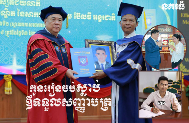 ភ្នំពេញ ៖ យុវជនម្នាក់ ជានិស្សិតបញ្ចប់ការសិក្សាថ្នាក់បរិញ្ញាបត្រ និងសល់តែ ៣ខែទៀត ត្រូវទទួលសញ្ញាបត្រ បែរជាជួបគ្រោះថ្នាក់ចរាចរណ៍ បណ្តាលឱ្យបាត់បង់ជីវិត និងត្រូវបានថ្នាក់ដឹកនាំសាលា សម្រេចប្រគល់សញ្ញា បត្រជូនឪពុកនិស្សិតរងគ្រោះ ដើម្បីជាការតបស្នងនូវការប្រឹងប្រែងរៀនសូត្ររបស់កូនប្រុសជាទីស្រលាញ់។