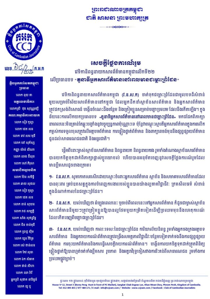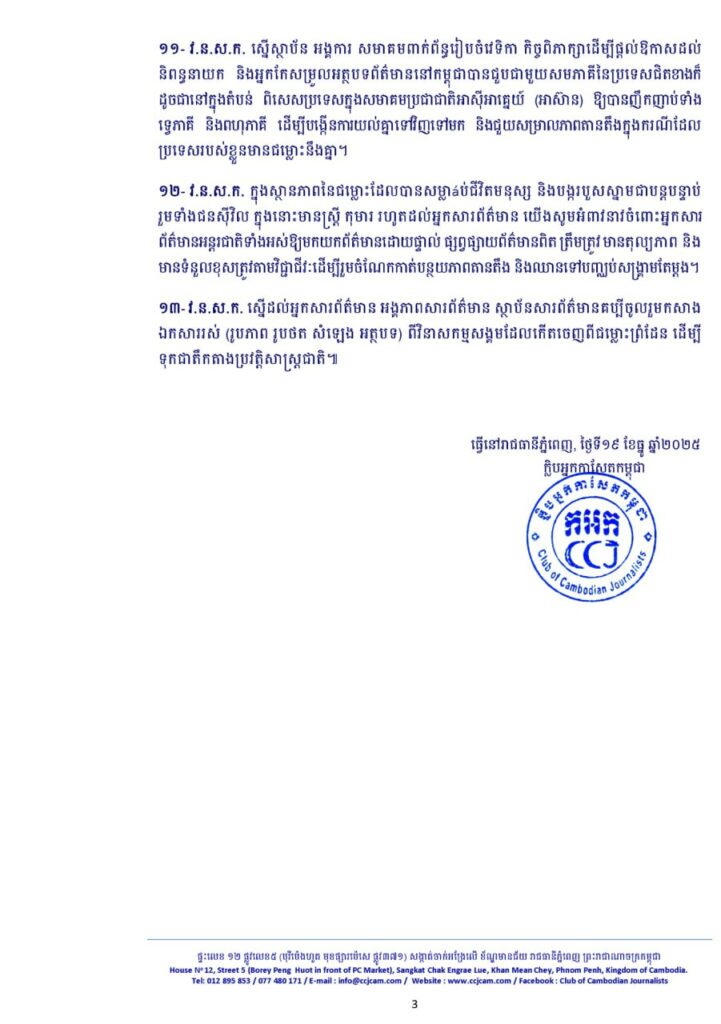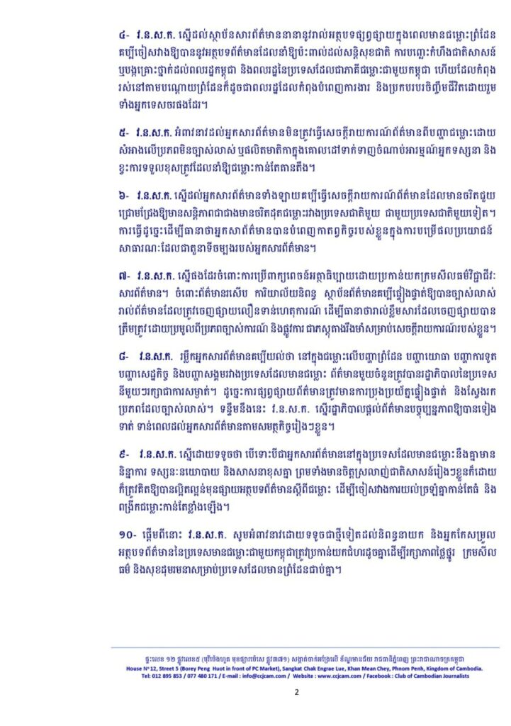រីឯចំណុចទី១៣ វ.ន.ស.ក. ស្នើដល់អ្នកសារព័ត៌មាន អង្គភាពសារព័ត៌មាន ស្ថាប័នសារព័ត៌មានគប្បីចូលរួមកសាងឯកសាររស់ (រូបភាព រូបថត សំឡេង អត្ថបទ) ពីវិនាសកម្មសង្គមដែលកើតចេញពីជម្លោះព្រំដែន ដើម្បីទុកជាតឹកតាងប្រវត្តិសាស្ត្រជាតិ ៕