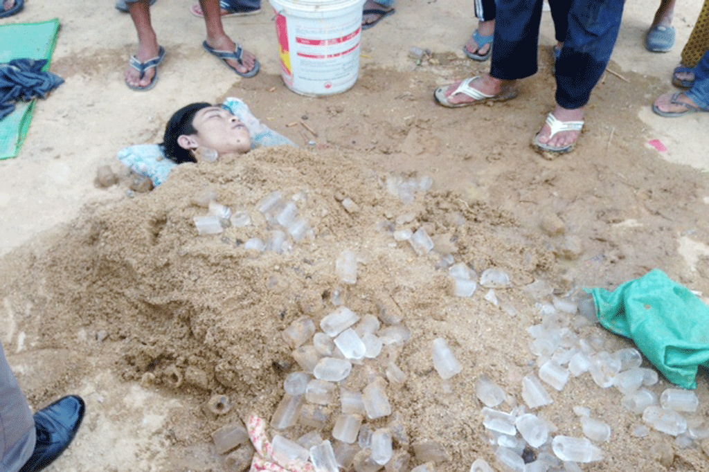 សង្គ្រោះបឋមព្រមទាំងយកខ្សាច់មកកប់និងដាក់ទឹកកកពីលើរួចហើយបានផ្តល់ដំណឹងទៅដល់សមត្ថកិច្ចនិងរថយន្តសង្គ្រោះអោយដឹកជនរងគ្រោះយកទៅព្យាបាល ពេលដែលរថយន្តសង្គ្រោះមកដល់ជនរងគ្រោះបានដាច់ខ្យល់ស្លាប់បាត់ទៅហើយ ។