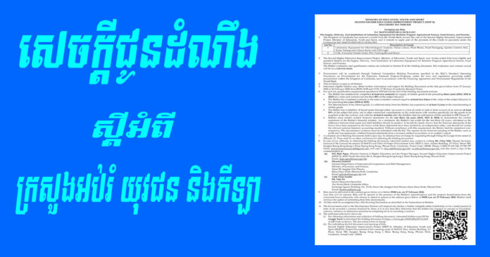Homeព័ត៌មានជាតិសេចក្តីជូនដំណឹង ស្តីអំពី ក្រសួងអប់រំ យុវជន និងកីឡា ព័ត៌មានជាតិព្រឹត្តិការណ៍សង្គម សេចក្តីជូនដំណឹង ស្តីអំពី ក្រសួងអប់រំ យុវជន និងកីឡា By Davin January 27, 2026 0 0 Share FacebookTwitterPinterestWhatsApp RELATED ARTICLES ព័ត៌មានជាតិ ស្ថាប័នសិទ្ធិមនុស្សកម្ពុជា បន្តប្តឹងទៅ អ.ស.ប ថៃរំលោភសិទ្ធិជនភៀសសឹកកម្ពុជា January 28, 2026 ព័ត៌មានជាតិ បញ្ជូនទៅតុលាការ មន្ត្រីរាជការចេញសែកស្អុយ ៥ម៉ឺនដុល្លារ January 28, 2026 ព័ត៌មានជាតិ សិស្ស៣០ម៉ឺននាក់ ទទួលផលពីកម្មវិធីផ្តល់អាហារតាមសាលារៀន January 27, 2026