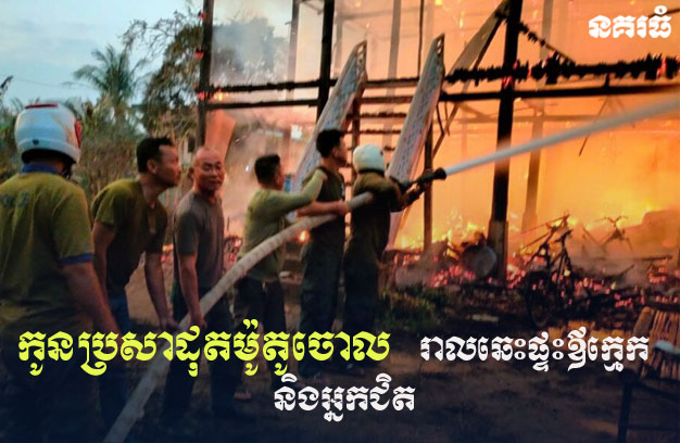 ខេត្តកំពង់ចាម ៖ បុរសប្រមឹកម្នាក់ ក្រោយពីផឹកស៊ីស្រវឹងធ្លាក់ភ្នែក មកដល់ផ្ទះ បង្ករឿងឈ្លោះប្រកែកជាមួយប្រពន្ធ រហូតដល់បែកគំនិតដុតម៉ូតូខ្លួនឯងចោល នៅក្រោមផ្ទះឪពុកក្មេក ធ្វើឱ្យរាលដាលឆេះផ្ទះឪពុកក្មេក និងរាលដាលឆេះផ្ទះអ្នកជិតខាង ២ខ្នងទៀត ហើយត្រូវបានជនរងគ្រោះជាម្ចាស់ផ្ទះ ប្តឹងសមត្ថកិច្ច ចាប់វាយខ្នោះបុរសប្រមឹក យកទៅចាត់ការតាមច្បាប់។