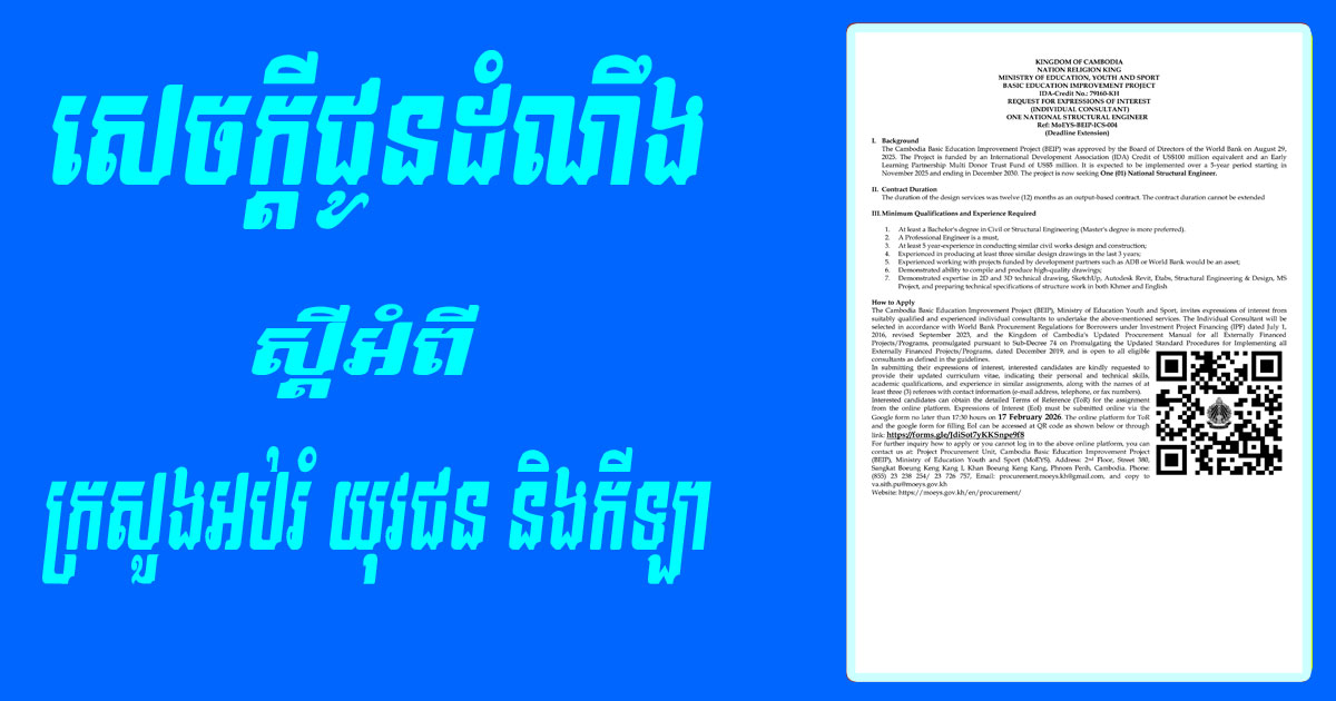 Homeព័ត៌មានជាតិសេចក្តីជូនដំណឹង ស្តីអំពី ក្រសួងអប់រំ យុវជន និងកីឡា ព័ត៌មានជាតិ សេចក្តីជូនដំណឹង ស្តីអំពី ក្រសួងអប់រំ យុវជន និងកីឡា By Davin February 4, 2026 0 0 Share FacebookTwitterPinterestWhatsApp RELATED ARTICLES ព័ត៌មានជាតិ សេចក្ដីជូនដំណឹង February 19, 2026 ព័ត៌មានជាតិ សេចក្ដីជូនដំណឹង February 19, 2026 ព័ត៌មានជាតិ សេចក្ដីជូនដំណឹង February 17, 2026