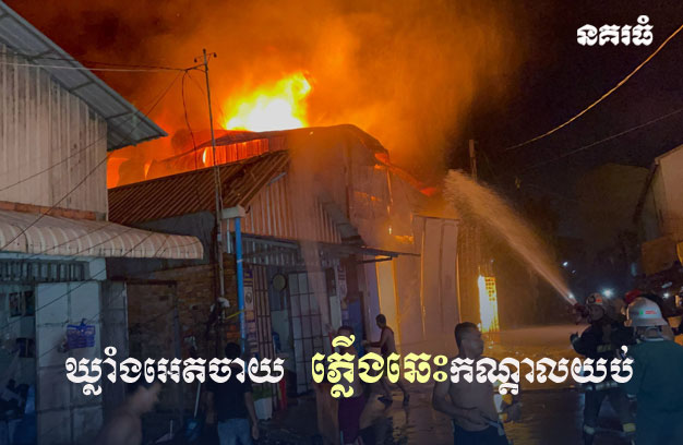 ភ្នំពេញ ៖ ឃ្លាំងស្តុកអេតចាយ មួយកន្លែង ត្រូវបានអគ្គិភ័យឆាបឆេះយ៉ាងសន្ធោសន្ធៅ ទាំងកណ្តាលយប់ បណ្តាលឱ្យខូចខាតស្ទើរទាំងស្រុង បង្កការភ្ញាក់ផ្អើលដល់សមត្ថកិច្ច បញ្ចេញរថយន្តពន្លត់អគ្គិភ័យ ជាច្រើនគ្រឿង ចុះជួយអន្តរាគមន៍បាញ់ទឹកពន្លត់។