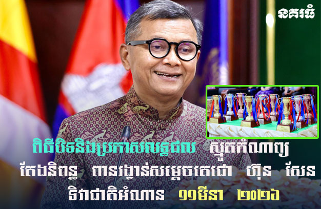 ភ្នំពេញ ៖ នាព្រឹកថ្ងៃទី១០ ខែមីនា ឆ្នាំ២០២៦ លោកបណ្ឌិត ហង់ជួន ណារ៉ុន ឧបនាយករដ្ឋមន្ត្រី រដ្ឋមន្ត្រីក្រសួងអប់រំ យុវជននិងកីឡា បានអញ្ជើញជាអធិបតីក្នុងពិធីបិទនិងប្រកាសលទ្ធផលការប្រកួតប្រជែង អានអត្ថបទ ស្មូតកំណាព្យ និងតែងនិពន្ធ «ពានរង្វាន់សម្តេចតេជោ ហ៊ុន សែន» នៃទិវាជាតិអំណាន ១១មីនា ២០២៦ និងមានការចូលរួមពីសំណាក់ លោក លោកស្រី ថ្នាក់ដឹកនាំក្រសួងអប់រំ យុវជននិងកីឡា តំណាងក្រសួងស្ថាប័នពាក់ព័ន្ធ សាស្រ្តាចារ្យសាលាមធ្យមសិក្សាវិចិត្រសិល្បៈ ប្រធានសមាគមសិល្បៈបុរាណខ្មែរ ថ្នាក់ដឹកនាំមន្ទីរ មាតាបិតាអ្នកអាណាព្យាបាល និងបេក្ខជនជ័យលាភី មកពី ២៥រាជធានី-ខេត្ត។