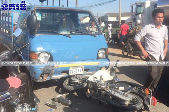 រថយន្ត១តោនកន្លះ ប្រជ្រៀតរុលទៅមុខ បុកម៉ូតូគុបជ្រុង រងរបួសធ្ងន់