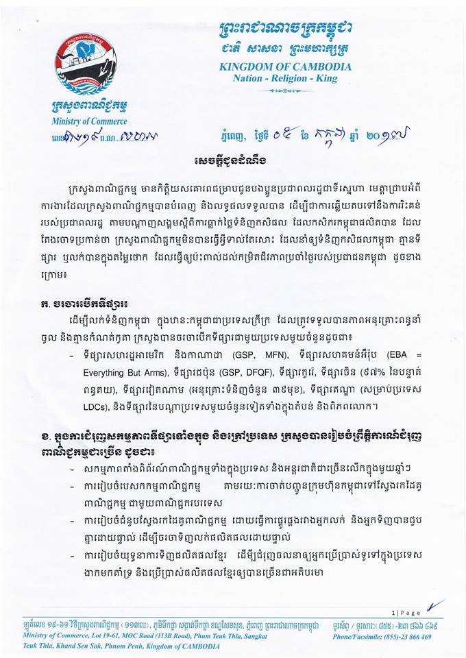 ភ្នំពេញៈ ក្រសួងពាណិជ្ជកម្ម បានចេញសេចក្ដីជូនដំណឹង ឆ្លើយតបទៅនឹងការរិះគន់ថា បញ្ហាទំនិញកសិផល កម្ពុជា គ្មានទីផ្សារ ឬ លក់បានក្នុងតម្លៃថោក ៕