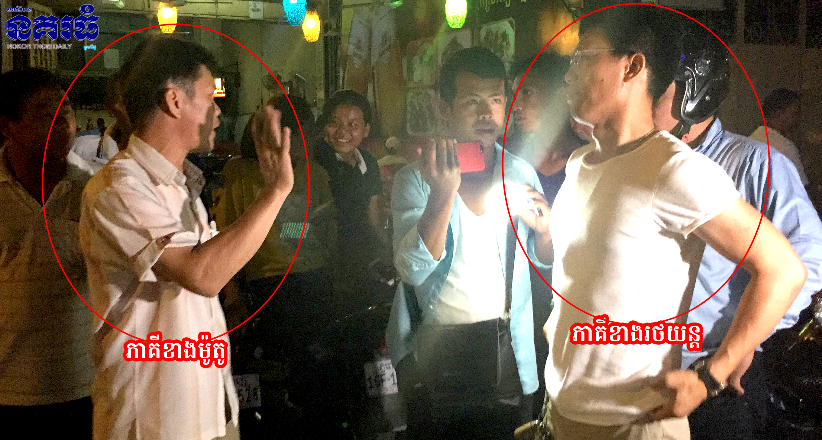 ​ដោយឡែក​ខាងម៉ូតូ​វិញរងការ​ខូចខាត​តិចតួច​ ចំណែក​មនុស្ស​រងរបួស​រលាត់ដៃរលាត់ជើង​ រងរបួសស្រាល​។ ដោយឡែក​ប្រភពពីខាងម៉ូតូវិញបាន​ឲ្យដឹងថា​ ខាងរថយន្ត​ជាអ្នក​បើក​មកកៀរម៉ូតូរបស់គាត់​ ហើយភ្លាមនោះដែរ​ ស្ត្រី​ជាប្រពន្ធ​បានចុះ​ពីលើ​រថយន្ត​ រួចហើយ​បានកាន់​កាំភ្លើង​ខ្លី​ មិនស្គាក់ម៉ាក​ មកគំរាម​រូបគាត់​ជាអ្នកបើកម៉ូតូ​ ដោយបាននិយាយថា​ ឯងស្គាល់ប្តី​អញ់អត់ឃើញដូចនេះ​ហើយ​ ទើបរូគាត់​ខឹងសម្បា​កើត​ជាជម្លោះពាក្យសម្តី​បន្តិច​​បន្តួច​ ។
