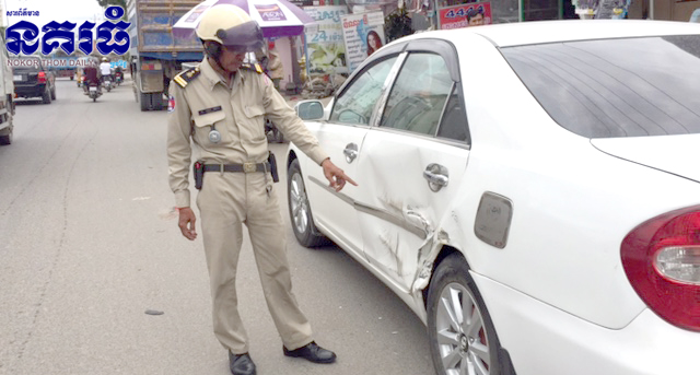 ភ្នំពេញ : រថយន្ត២គ្រឿង បើកបរប្រញាប់រៀងខ្លួន រថយន្តបែនយីឌុបពណ៍ស ម៉ាកហុីយ៉ាន់ដាយពាក់ស្លាកលេខភ្នំពេញ ៣A-៩៥១១ បត់ស្ដាំលឿនពេក កៀររថយន្តបាឡែន ពណ៍ស ពាក់ស្លាកលេខភ្នំពេញ ២L-៩១២៩ បណ្ដាលឲ្យខូចខាតខ្ទេចទ្វារថយន្តមួយចំហៀង ហេតុការន៍នេះកើតឡើងកាលពីវេលាម៉ោង១១និង៣០នាទីថ្ងៃត្រង់ ថ្ងៃទី២៣ ខែសីហា ឆ្នាំ២០១៧ នៅចំណុចស្តុបមន្ទីរពហុព្យាបាលបញ្ញាសក្តិ តាមផ្លូវ២៧១ កែងផ្លូវ៣៧១ សង្កាត់ចាក់អង្រែលើ ខណ្ឌមានជ័យ ។