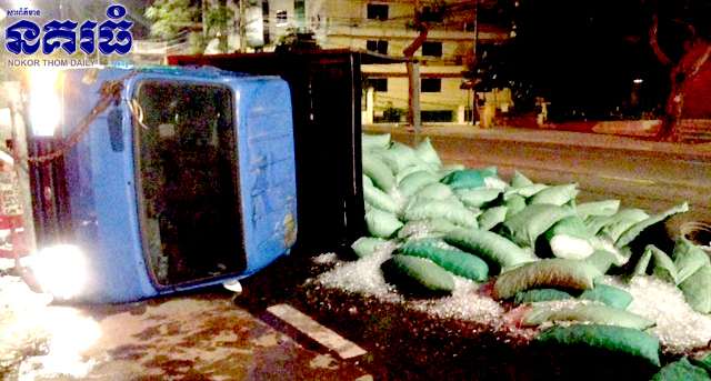 ភ្នំពេញ៖ បុរសម្នាក់បើកបររថយន្តកូរ៉េដឹកទឹកកកមួយគ្រឿង បោះពួយយ៉ាងលឿន ធ្វើឲ្យដាច់កង់ក្រោយរថយន្ត បណ្តាលឲ្យក្រឡាប់ផ្ងាជើងចាក់ទឹកកកចោលពេញផ្លូវ ហេតុការណ៍នេះកើតឡើងកាលពីវេលាម៉ោង១និង៥០នាទីរំលងអធ្រាត្ រឈានចូលថ្ងៃទី២៤ ខែសីហា ឆ្នាំ២០១៧ តាមបណ្តោយផ្លូវសហព័ន្ធរុស្ស៉ី ខាងមុខក្រសួងការងារ ស្ថិតក្នុងសង្កាត់ទឹកល្អក់ទី១ ខណ្ឌទួលគោក។