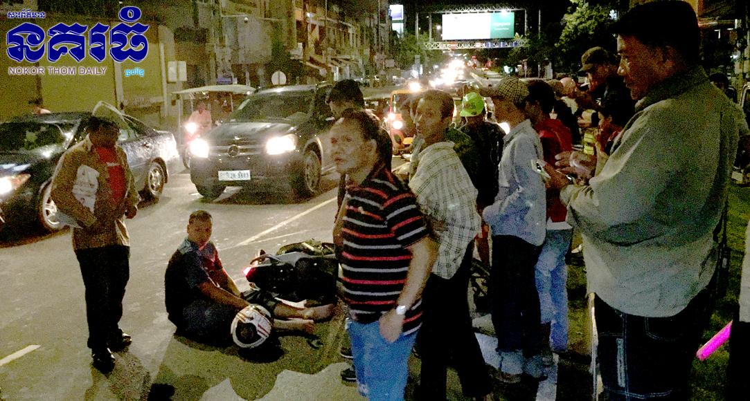 ភ្នំពេញ ៖ ស្ត្រីជាអ្នកលក់សាំងម្នាក់ ដើរឆ្លងផ្លូវយកសាំងទៅចាក់ឲ្យអ្នកទិញ ត្រូវបុរសម្នាក់ជិះម៉ូតូក្នុងស្ថានភាពស្រវឹងស្រាបុកដួលបាក់ធ្មេញមុខអស់មួយ ហើយម៉ូតូខ្ទាតទៅប៉ះរថយន្តមួយគ្រឿងទៀត ហេតុការណ៍នេះបានកើតឡើងនៅវេលាម៉ោង៩និង៣០នាទីយប់ ថ្ងៃទី២៩ ខែសីហា ឆ្នាំ២០១៧ ជិតស្ពានអាកាសស្ទឹងមានជ័យ ផ្លូវព្រះមុនីរ៉េត សង្កាត់បឹងសាឡាង ខណ្ឌទួលគោក ។