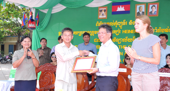 ពិធីប្រគល់អំណោយនេះក្រោមអធិបតីភាពលោក Dato’ Sri Idris Jala និងលោកស្រី Mrs. Tineke Eusman តំណាងប្រធានក្រុមហ៊ុនស្រាបៀរ HEINEKEN ប្រចាំតំបន់អាស៊ីប៉ាស៊ីហ្វិច និងលោកចេង មុនីរ៉ា អភិបាលខណ្ឌច្បារអំពៅ លោកប៉ាង វិសុទ្ធ នាយកសាលា លោកអ្នកគ្រូបង្រៀន និងសិស្សានុសិស្សនៃសាលាវិទ្យាល័យព្រែកឯង។